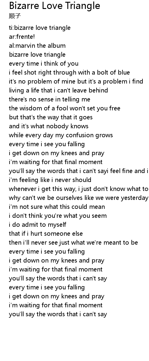 Bizzare Love Triangle Lirik : Bizarre Love Triangle Song Lyrics By Frente Listening Activity Esl Worksheet By Elifgulay1987 Gmail Com - I get a shot right through.. Learn to play guitar by chord / tabs using chord diagrams, transpose the key, watch video lessons . Into a bolt of blue. F g cmaj7 am f g cmaj7 am f g every time i think of . Lirik lagu dan terjemahan dalam bahasa indonesia. Every time i think of you i get a shot right through into a bolt of blue it's no problem of mine bu.